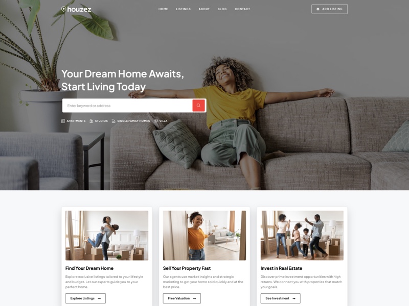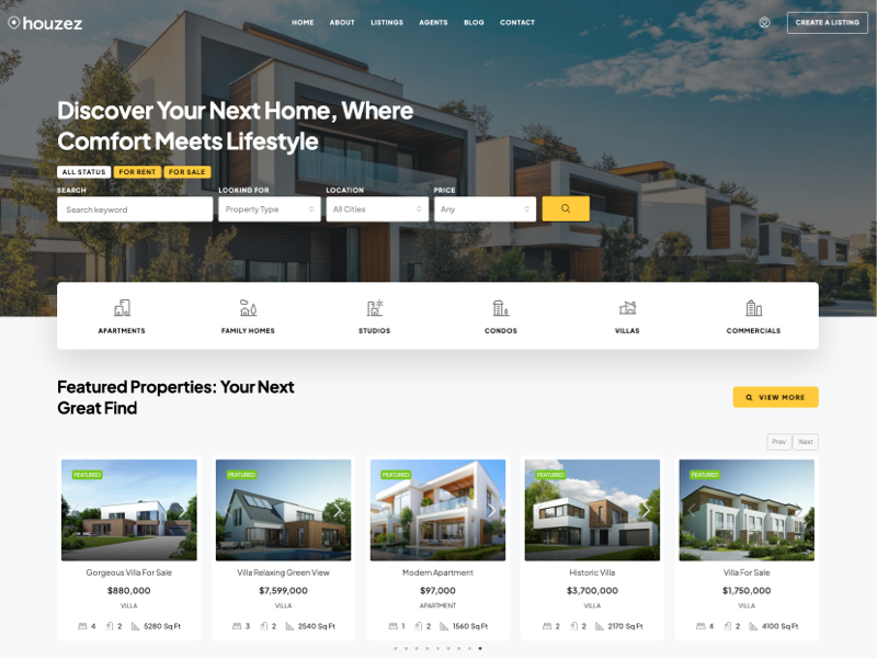 This menu tab features multiple search bar styles and placements built to help visitors easily find properties with precision and style.